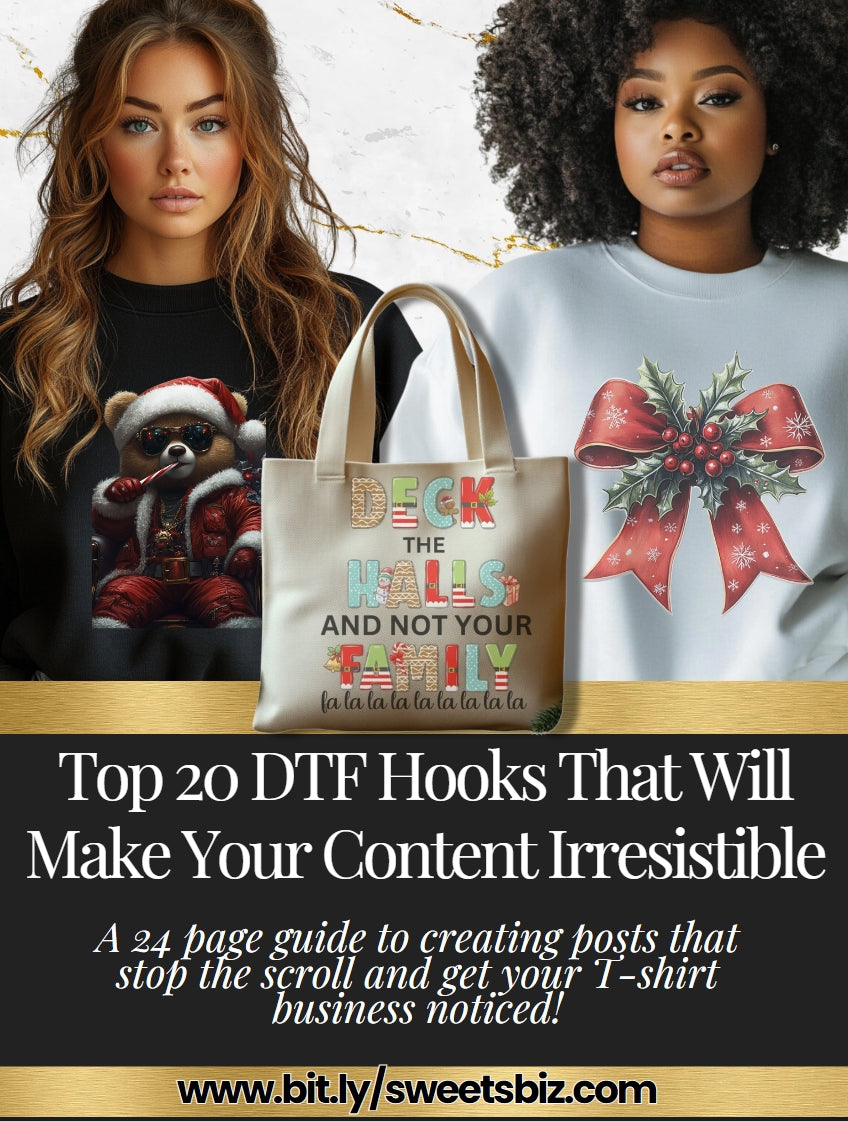 Marketing Ebook - "Top 20 DTF Hooks That Will Make Your Content Irresistible": Normally priced at $27, now included for just $12.99 as part of this pack. This 24-page ebook is packed with expert strategies to help you create social media posts that stop the scroll, capture attention, and convert into sales. It’s the marketing toolkit you need to turn those DTF transfers into real profit.